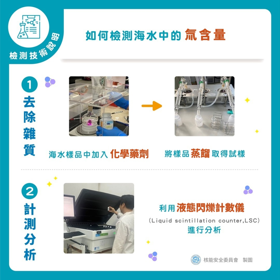 檢測方法可分為兩大步驟,首先為去除雜質,海水樣品中加入化學藥劑使雜質沉澱,待雜質沉澱後將樣品蒸餾取得試樣;其次為計測分析,利用液態閃爍計數儀(Liquid Scintillation Counter,...