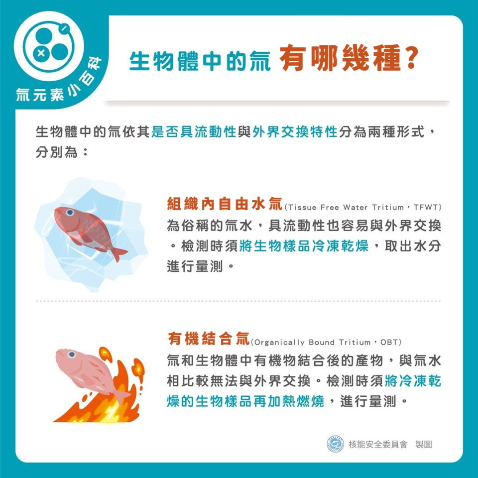 生物體中的氚依其是否具流動性與外界交換特性分為兩種形式,分別為: 組織內自由水氚(Tissue Free Water Tritium, TFWT)為俗稱的氚水,具流動性也容易與外界交換。檢測時須將生...