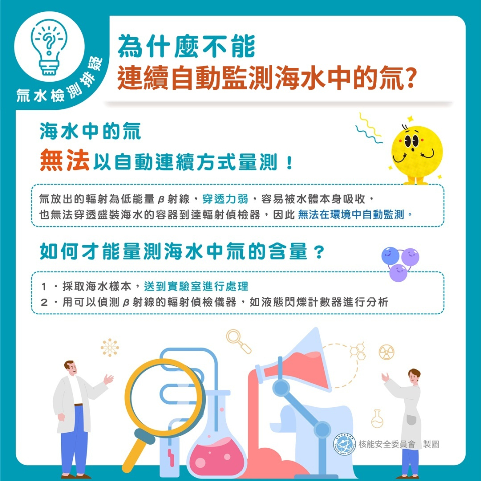 由於氚放出的輻射為低能量β射線,穿透力弱,容易被水體本身吸收,也無法穿透盛裝海水的容器到達輻射偵檢器,因此無法以自動連續方式量測環境以及海水中的氚。 若想要量測海水中氚的含量,必須採取海水樣本,到實...