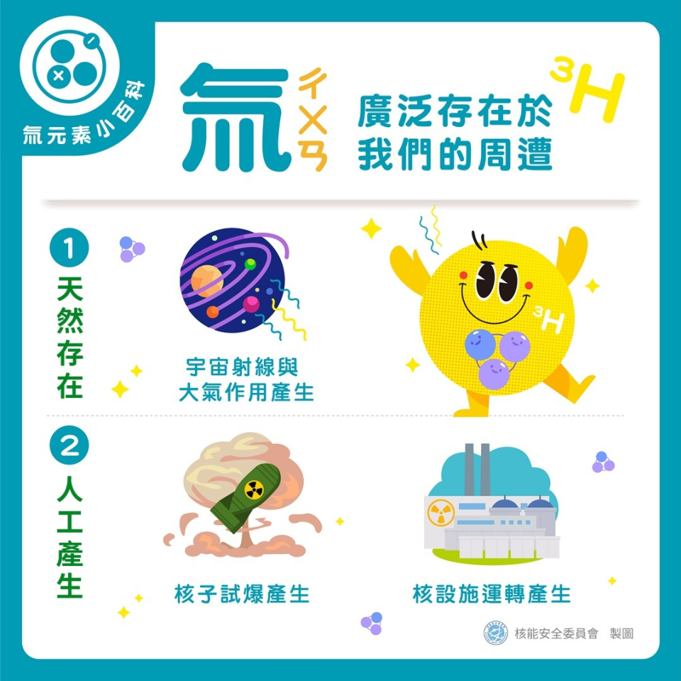 氚有自然存在的,也有人工產生的。自然界中的氚由宇宙射線與大氣分子相互作用而產生;環境中的氚除了天然存在的氚,還有人工產生的氚。人工氚主要來自核子核爆及核能發電等核設施運轉過程中產生。