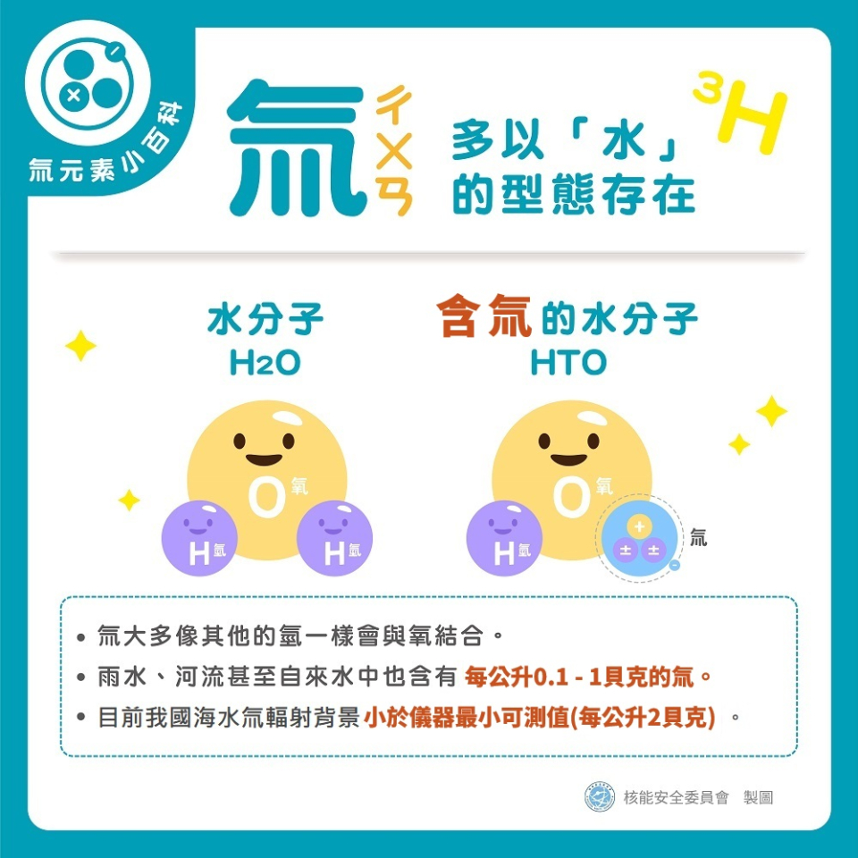 氚大多像其他氫一樣會與氧結合。雨水、河流甚至自來水中也含有每公升0.1-1貝克的氚。目前我國海水氚輻射背景小於儀器最小可測值(每公升2貝克)。